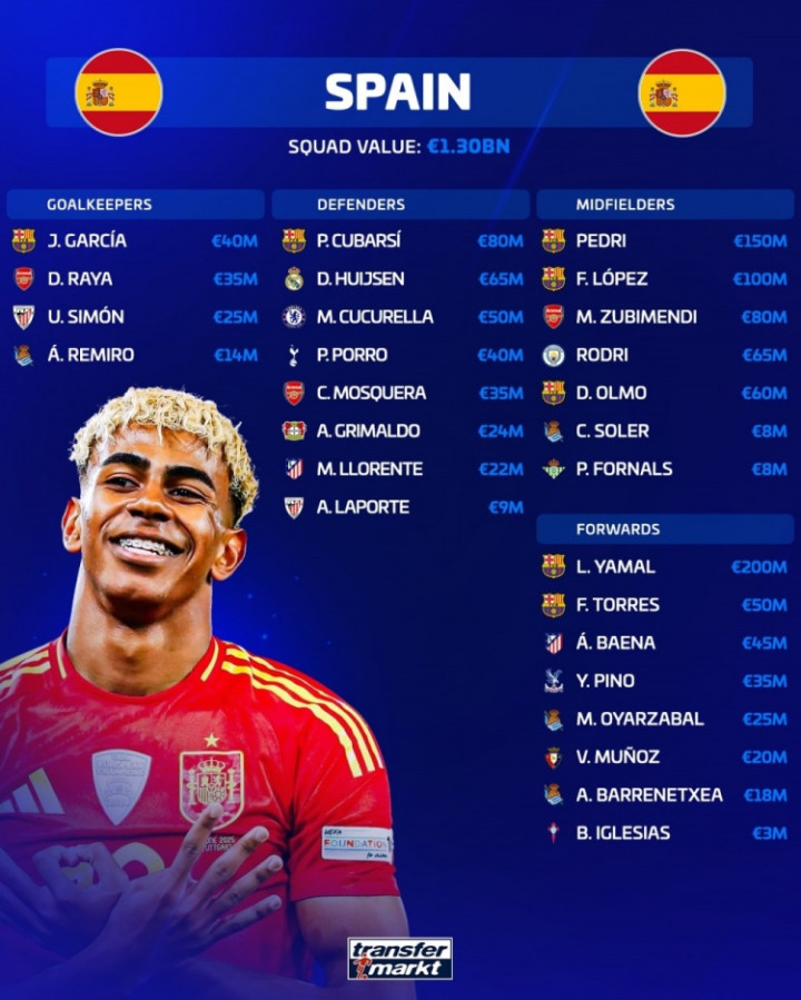 佩德里(1.5亿欧)、费尔明(1亿欧)、苏维门迪(8000万欧)、罗德里(6500万欧)、奥尔莫(6000万欧)、卡洛斯·索莱尔(800万欧)、福纳尔斯(800万欧)