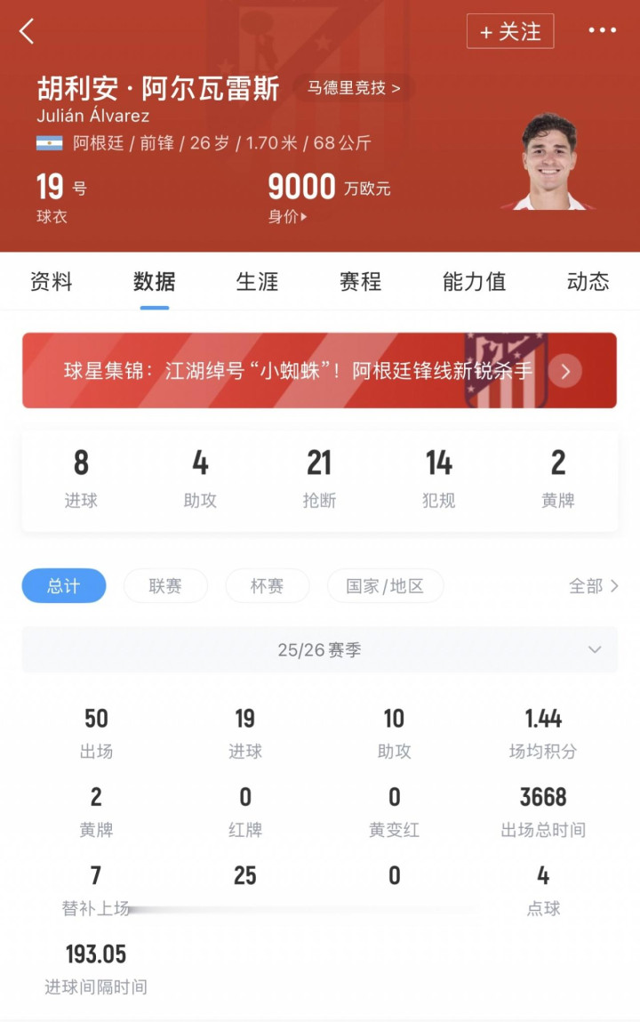 2024年夏窗,马竞破钞7500万欧元+2000万浮动的用度从曼城签下阿尔瓦雷斯,当今他共为马竞出场104次,打入48球17助攻。