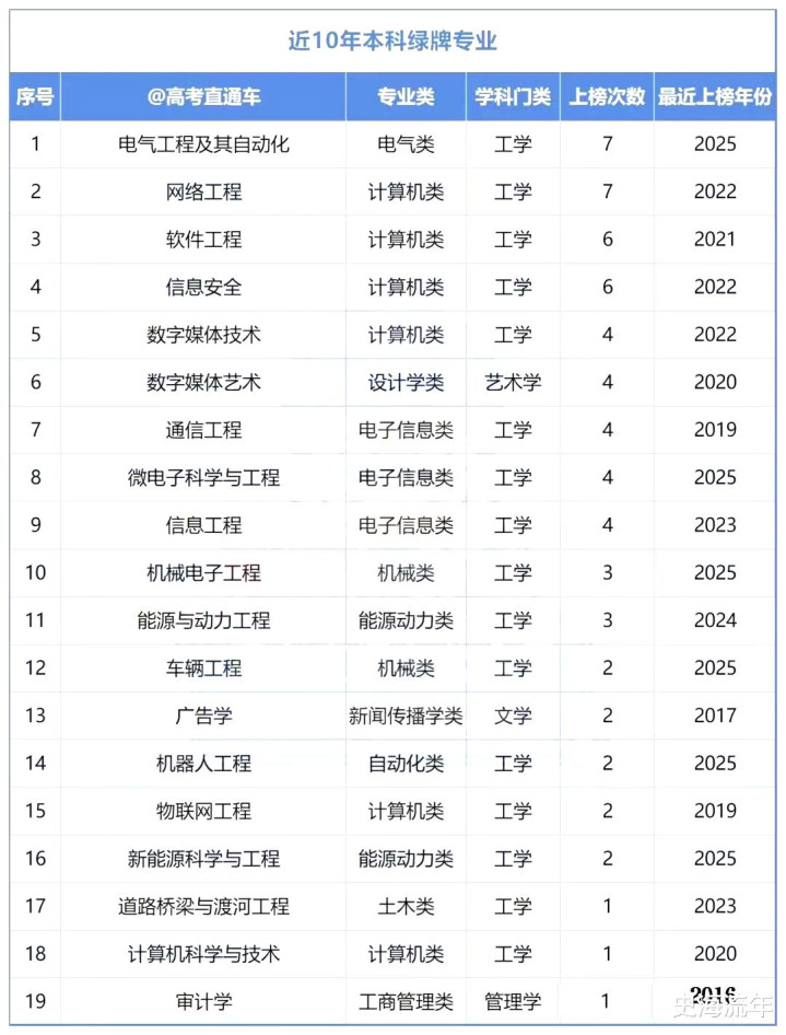 2016年至2025年,我国高校作事中登上本科绿牌专科的共有19个。其中,电气工程过头自动化、收集工程均有7次上榜,比肩第一位。软件医嘱、信息安全,各有6次榜上知名,比肩第三位。