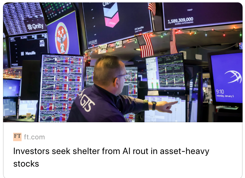 【环球网财经概述报谈】据Financial Times等外媒报谈,近期受东谈主工智能颠覆风险担忧影响,内行股市出现结构分化,投资者纷繁减握高风险轻资产板块,转向公用做事、动力、材料等领有什物质产的资产密集型股票寻求避险。