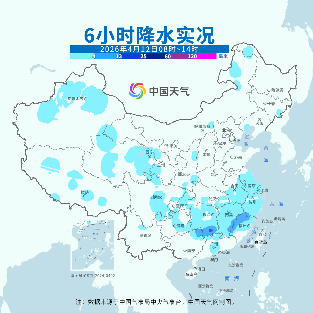 先说说南边的降雨。今天,南边本轮强降雨经过已干与尾声,08时至14时,广西东北部、湖南南部、江西南部、福建西部和北部、浙江南部依然有赫然降雨,但总体强度和对流皆比昨天弱了不少。