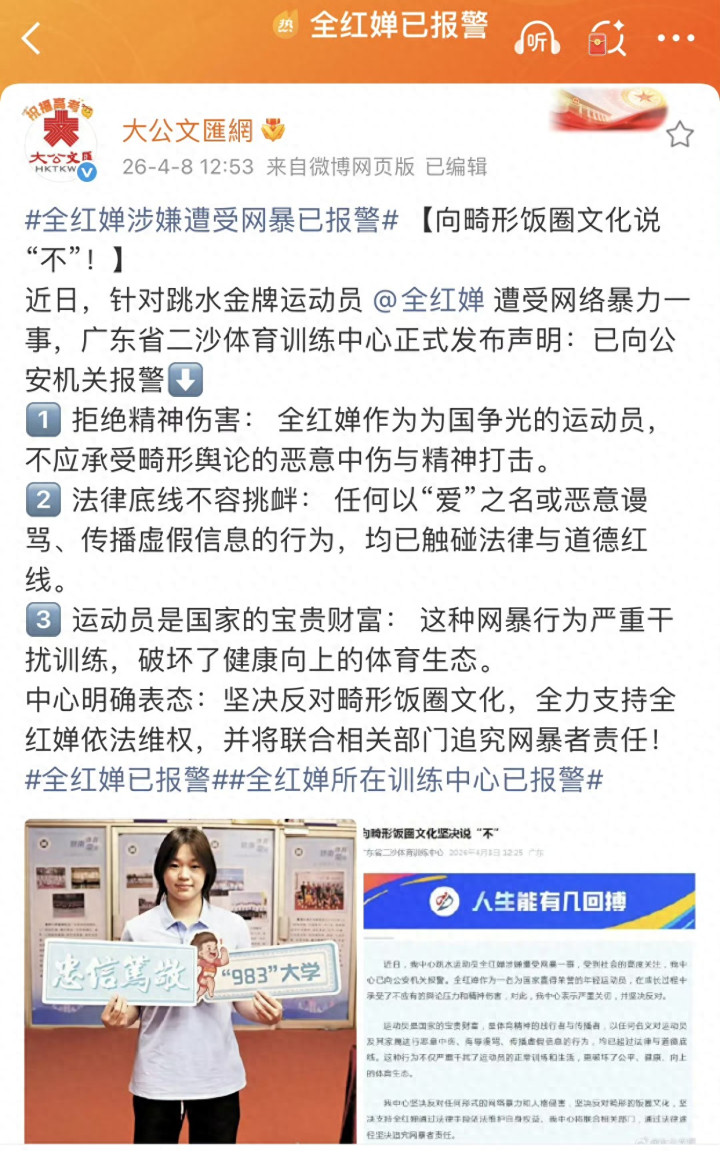 4月8号这天,体育圈出了件大事。广东省二沙体育测验中心在官方公众号发了个公告,标题径直叫《向汗漫饭圈文化刚硬说"不"》,说全红婵被东说念主网暴,仍是报警了。